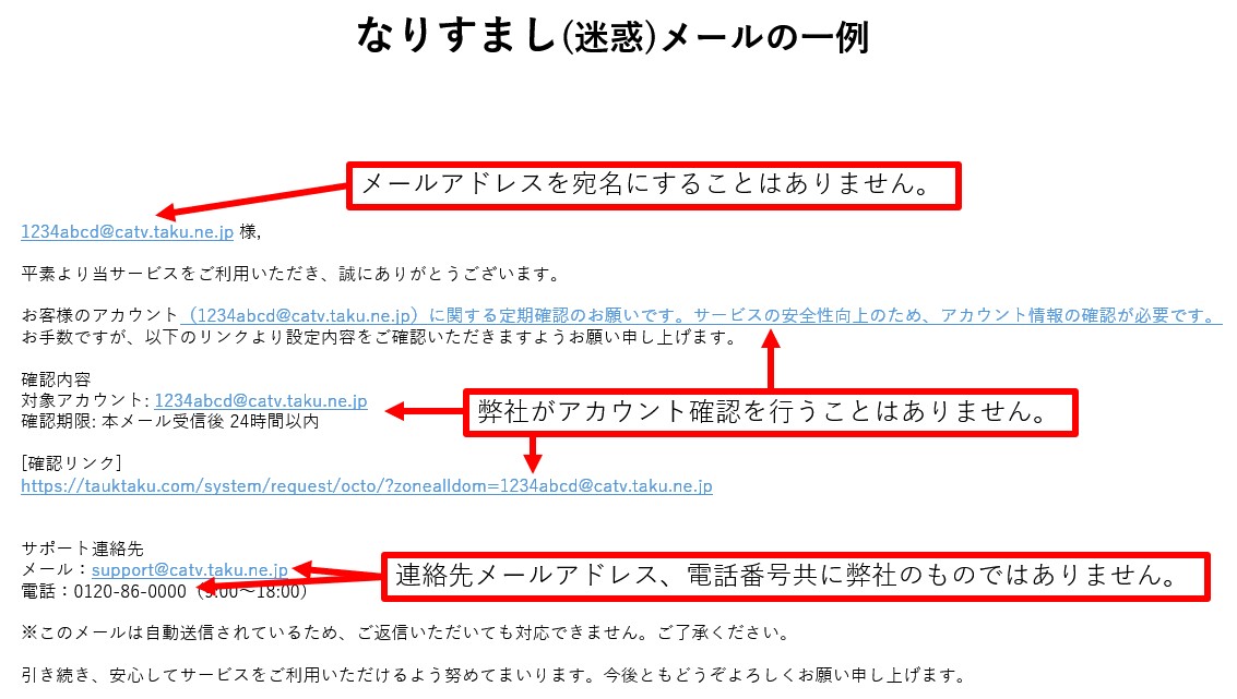 support@taku.ne.jp など、上記以外のアドレスから届いた場合、弊社からのメールではありません。